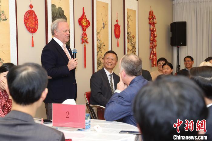 12月16日,加拿大白求恩医学发展协会会长艾瑞特(站立者)在招待会上发言。中新社记者 余瑞冬 摄
