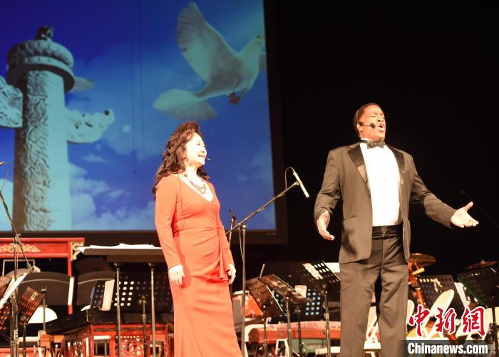 当地时间1月27日晚,以纪念中美建交45周年为主题的鹰飞龙腾新年音乐会在美国洛杉矶唱响。图为中美两国歌唱家联袂演唱《我爱你中国》。 中新社记者 张朔 摄