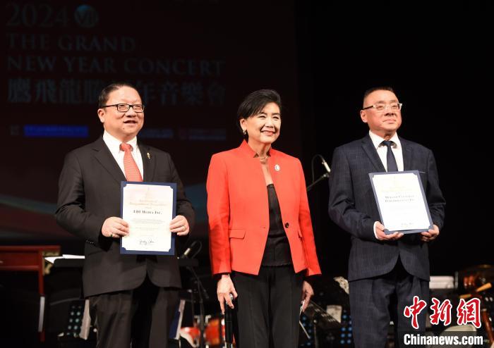 当地时间1月27日晚,以纪念中美建交45周年为主题的鹰飞龙腾新年音乐会在美国洛杉矶唱响。图为美国联邦众议员赵美心(中)向美国鹰龙传媒董事长苏彦韬(左)等主办方代表颁发贺状。 中新社记者 张朔 摄