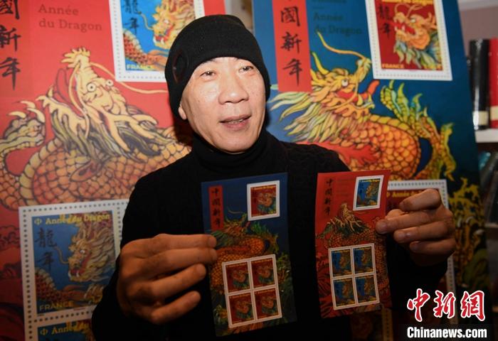 当地时间1月26日,法国发行龙年生肖邮票,为中法建交60周年增添浓郁的节庆氛围。图为法国邮政官员展示邮票。 中新社记者 李洋 摄