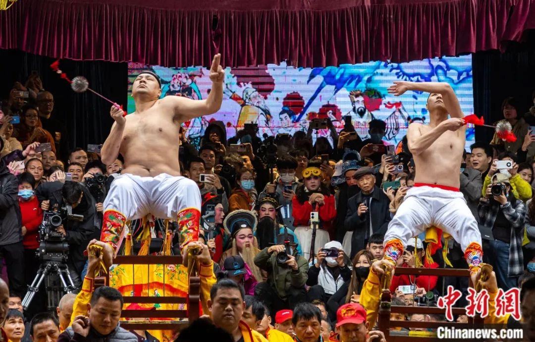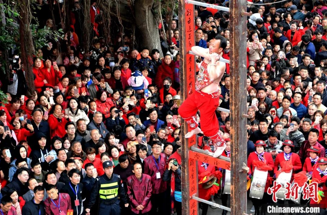 “僮身”表演者在莆禧古城“上刀梯”祈福。中新社记者 王东明 摄
