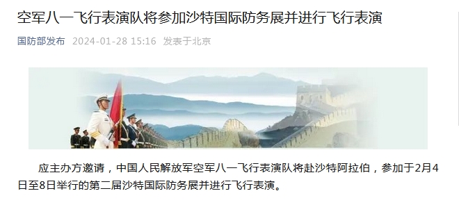 中新网1月28日电 据国防部官方微信消息,应主办方邀请,中国人民解放军空军八一飞行表演队将赴沙特阿拉伯,参加于2月4日至8日举行的第二届沙特国际防务展并进行飞行表演。