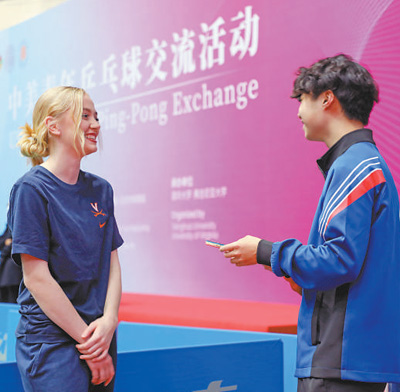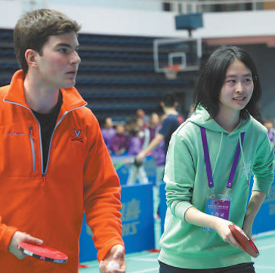 弗吉尼亚大学学生米莎与清华大学学生曾加宝组成搭档。在练习环节中,对手朝着米莎的方向打来一记高难度弧圈球,米莎一时间有些不知所措,只听曾加宝喊了一句“我来”,便眼疾手快地冲了过去,挡在米莎前面,接住了这个球。这有趣又温馨的一幕,引来了现场观众的掌声,也瞬间拉近了两个年轻人的距离。“我的搭档一直鼓励我,耐心地指导我握拍、击球。我们一起讨论乒乓球和学业,现在已经成了朋友。”米莎说。