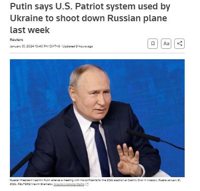 中新网2月1日电 据路透社报道,俄罗斯总统普京当地时间1月31日表示,俄方确认此前载有被俘乌克兰军事人员的俄伊尔-76军用运输机是被美制“爱国者”导弹系统击落。