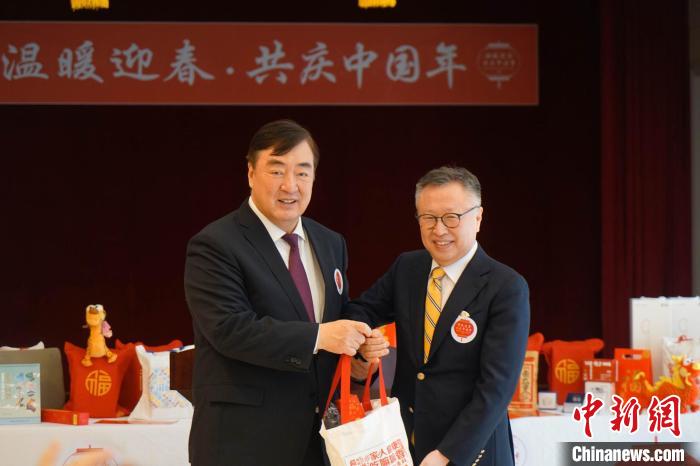 图为中国驻韩国大使邢海明(左)向与会代表发放春节包。金琳 摄