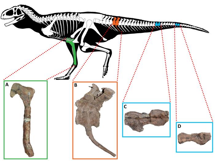 受病变影响的巴塔哥尼亚阿贝力龙骨骼。A.柯氏基尔梅龙右胫骨内侧视图;B.加氏奥卡龙的第5和第6尾椎骨及第5脉弓左侧视图;C和D为迷雾啮王龙的中和后尾椎骨左侧视图(图片来自Ales)。施普林格·自然/供图
