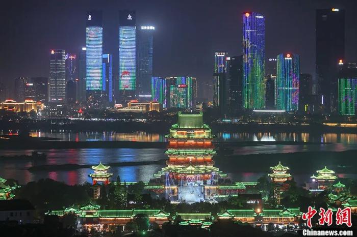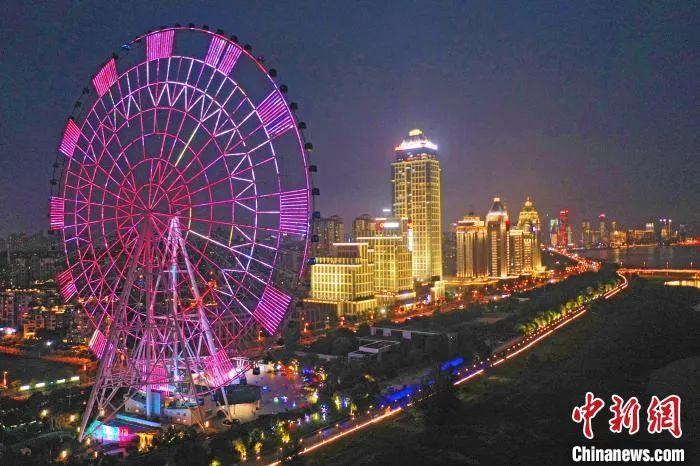 矗立在赣江之畔的“南昌之星”摩天轮亮起绚丽的灯光,与沿江的高层建筑交相辉映。刘占昆 摄