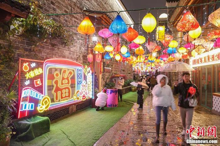 江西南昌万寿宫历史文化街区,市民从挂满花灯的小巷内走过。刘力鑫 摄