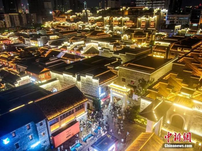航拍江西南昌万寿宫历史文化街区,不少游客在古色古香、灯火璀璨的街区中观光游玩。刘力鑫 摄