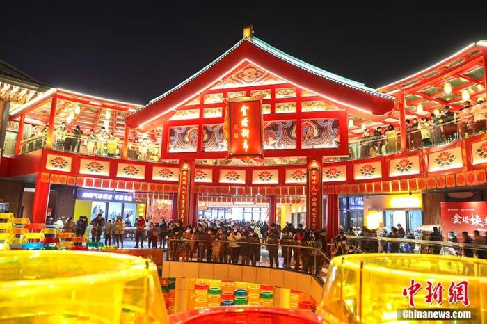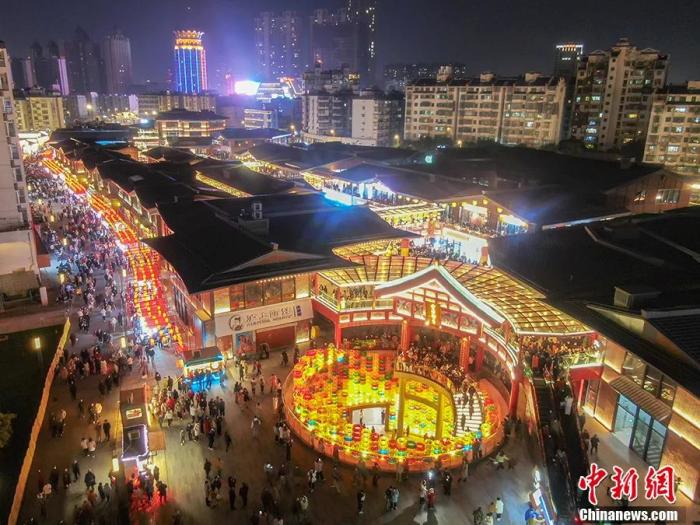 图为无人机航拍古色古香年味十足的绳金塔历史文化街区,灯火璀璨,人潮涌动。 刘力鑫 摄