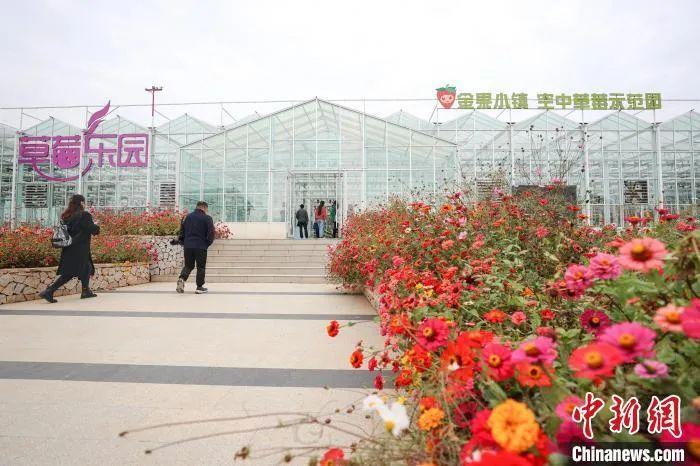 图为南昌安义县乔乐乡的金果小镇空中草莓示范园,游客走进园内参观。刘力鑫 摄