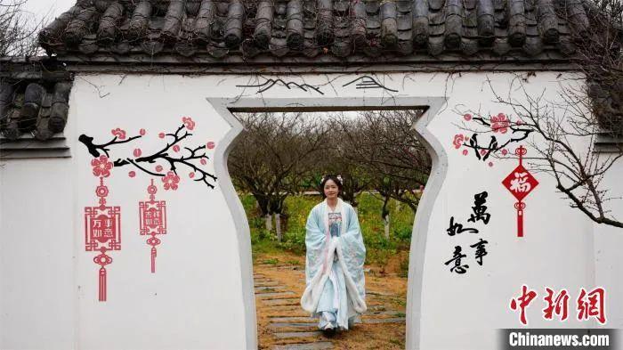 图为江西南昌县凤凰沟梅园内身着汉服的游客正在游园。巫发阳 摄