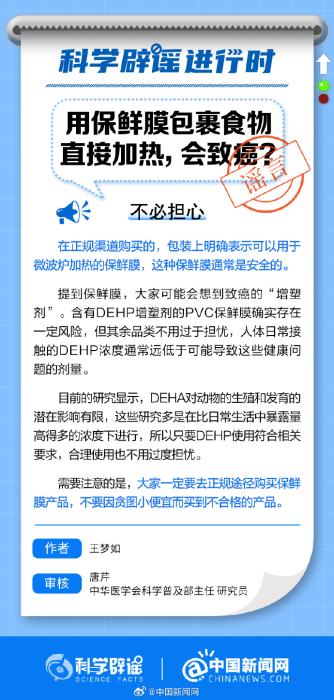 中新网1月31日电 在正规渠道购买的,包装上明确表示可以用于微波炉加热的保鲜膜,通常是安全的。提到保鲜膜,大家可能会想到致癌的“增塑剂”。含有DEHP增塑剂的PVC保鲜膜确实存在一定风险,但其余品类不用过于担忧。(来源:@科学辟谣 中国新闻网微博)
