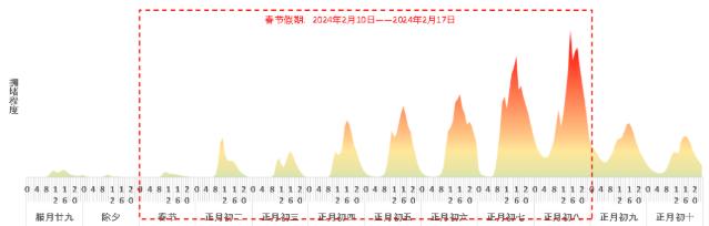 春节假期公路网流量将呈现“前低后高”的特征,除夕、初一路网流量达到假期低谷,正月初二起,路网流量逐步回升,正月初八集中返程,出现春节期间最高峰。春节期间出程与节日后期返程的潮汐特征明显,9-12时和14-19时为易发生拥堵时段。