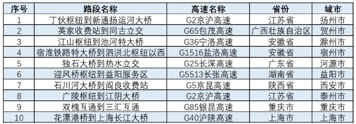 春节期间,全国高速公路预计易发生拥堵缓行的路段,如下表所示。