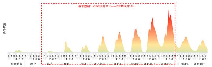 此外,春节期间出程与节日后期返程的潮汐特征明显,9-12时和14-19时为易发生拥堵时段。