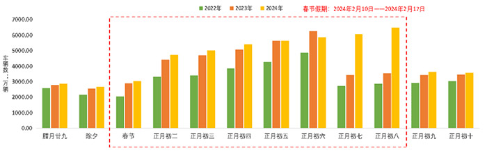 报告显示,预计春节期间(含除夕),全国高速公路日均流量约为5030万辆,较2023年春节同期日均增长11.6%左右。整个春节流量峰值出现在春节假期的最后一天(正月初八),预计达6520万辆左右,创历年春节流量新高。