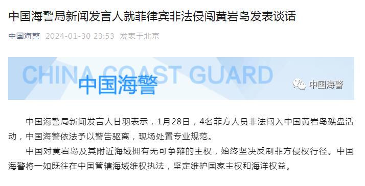 中新网1月31日电 据中国海警微信公众号30日消息,中国海警局新闻发言人甘羽表示,1月28日,4名菲方人员非法闯入中国黄岩岛礁盘活动,中国海警依法予以警告驱离,现场处置专业规范。