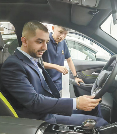 埃及首都开罗,热闹繁华的穆罕迪森区,阿拉伯国家联盟大街上车水马龙。走进一家汽车展销店,一众知名品牌汽车中,来自中国的新能源汽车格外引人注目。