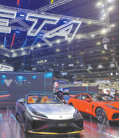 在2023年举办的第四十届泰国国际汽车博览会上,中国品牌新能源汽车广受关注。图为哪吒汽车展区。