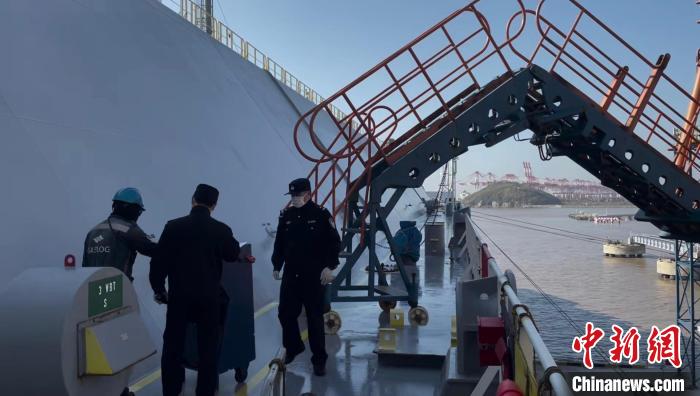 洋山边检站民警登轮对液化天然气运输船实施入境核查。(李娜 摄)