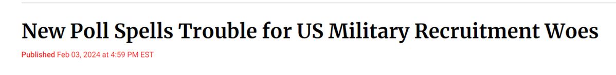 2023年12月,美国国防部人事与战备事务代理副部长瓦奇拉尼称,2023年征兵不顺,包括陆、海、空3军种都未招满,一共短缺4.1万人。