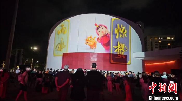 当天晚上,多娜·琳杜公园内剧院的外墙,投影出中国文化元素灯光秀。画面中,十二个生肖福娃次第给观众拜年,中国传统时令节气习俗一一展演,格外吸睛。