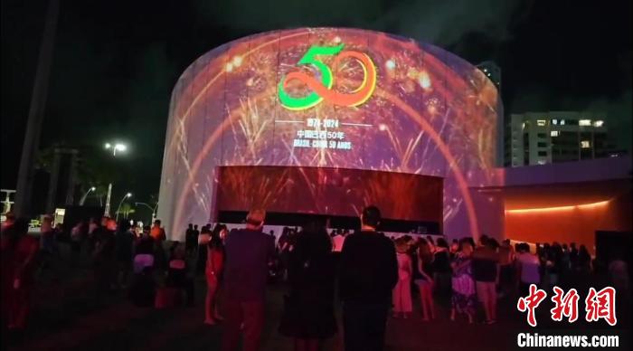 2月3日晚间,累西腓灯光秀汇演活动中展示了中巴建交50周年的纪念标志。曹璇摄