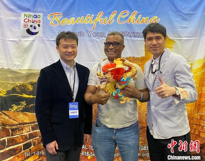 适逢龙年春节前夕,中国展台摆放着文化和旅游部为龙年“欢乐春节”全球活动制作的吉祥物——“欢乐春节”吉祥龙,备受展会现场的美国民众喜爱,不少参观者很熟悉中国的生肖文化。