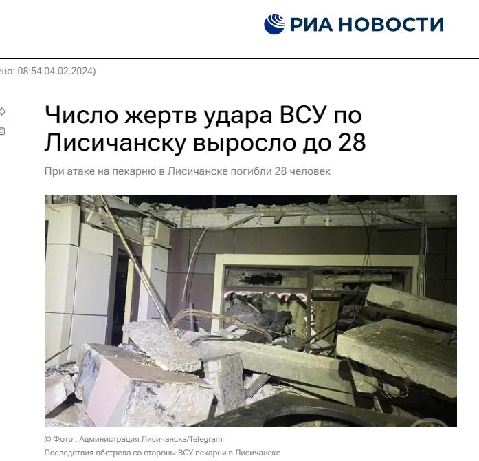 中新网2月4日电 据俄新社报道,当地时间4日,卢甘斯克地区领导人帕谢奇尼克在社交媒体上发文称,该地区利西昌斯克市一家面包坊遭乌军炮击,已造成28人死亡,其中包括一名儿童。