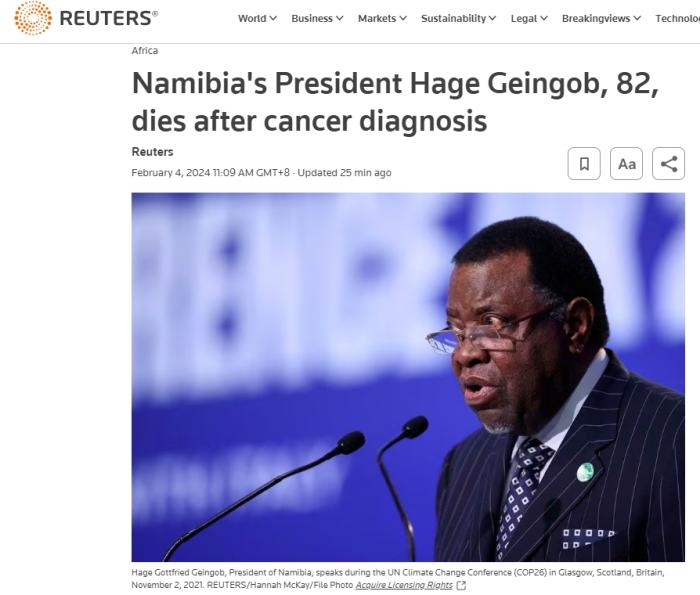 路透社称,纳米比亚共和国总统社交媒体账号并未解释该国总统去世的原因,但哈格·根哥布上月底曾表示,自己被诊断出患有癌症,将前往美国治疗。