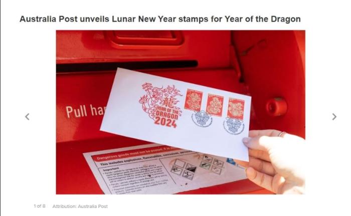 澳大利亚邮政近日推出了龙年特别版中国春节邮票。图片澳大利亚第九新闻网站截图。