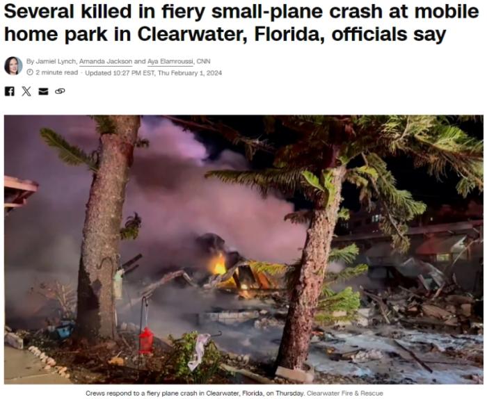 中新网2月2日电 据美国有线电视新闻网(CNN)报道,当地时间2月1日晚,一架小型飞机在美国佛罗里达州克利尔沃特市的一处公园坠毁。