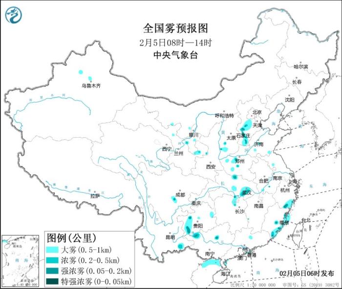 中央气象台2月5日06时继续发布大雾黄色预警:预计,5日早晨至上午,雷州半岛沿岸海域、粤西沿岸海域、北部湾偏北海域、福建沿岸的部分海域将有大雾,能见度不足1公里。此外,河北西部、山西西南部、河南南部、湖北中东部、浙江东南部、福建东部、贵州西部等地有大雾天气,局地有能见度不足200米的强浓雾。