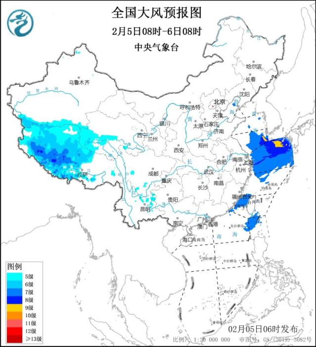 中央气象台2月5日06时继续发布大风蓝色预警:预计,2月5日08时至6日08时,西藏中西部、青海西南部等地将有5~7级、阵风8级的大风;黄海南部海域、东海大部海域、台湾海峡、巴士海峡将有7~8级、阵风9级的大风,其中黄海东南部、东海东北部的部分海域风力可达9级、阵风10级。