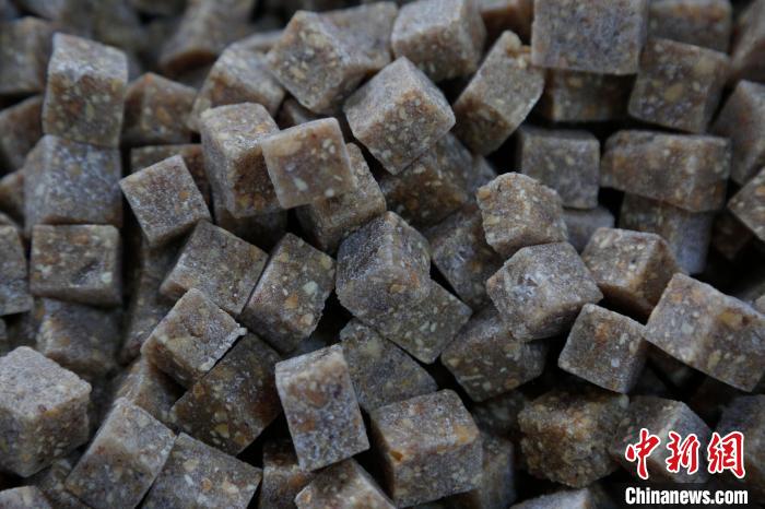 晋祠桂花元宵,馅料是灵魂。传统晋祠桂花元宵的馅料需要将核桃、芝麻、花生翻炒去皮后,再把糖稀加热化开,加入白糖、冰糖、纯天然玫瑰花酱和桂花酱翻炒,炒制完成后放入模子压实擀平,晾晒切块。