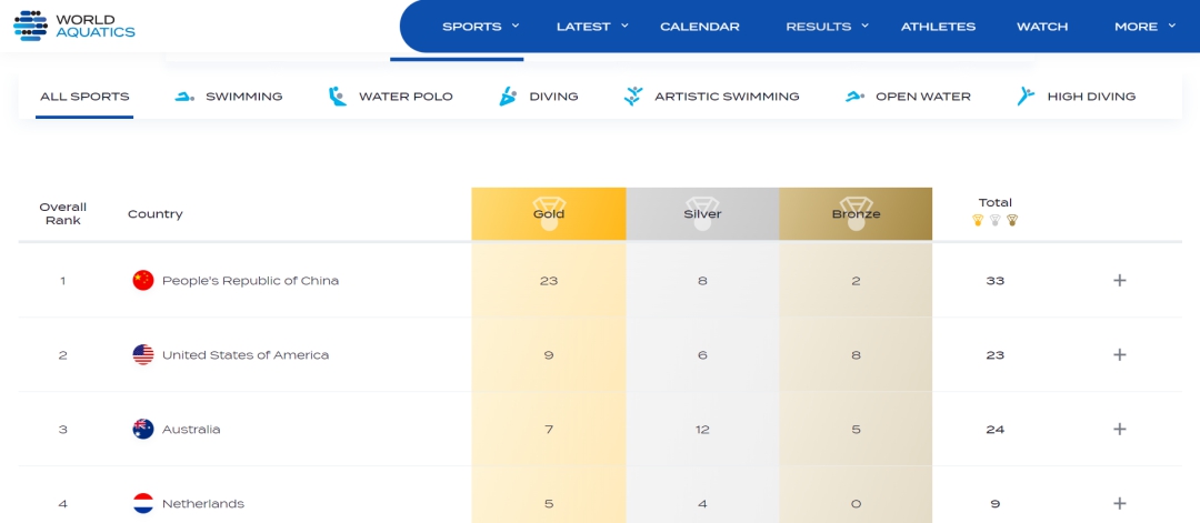图为奖牌榜。图片来源:世界泳联网站截图