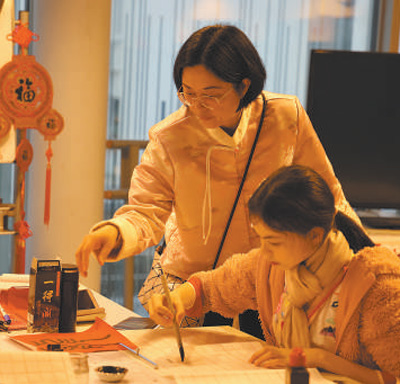 11岁的拜德细心地勾勒着龙的轮廓。他说:“我知道十二生肖,龙在中国文化里代表着力量和好运。”正在学写“福”字的爱丽说:“我爷爷和爸爸都去过中国,说那里风景很美,我长大也要去中国看看。”