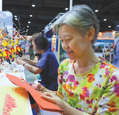 1月25日,在泰国国际旅游展上,参观者体验中国剪纸。