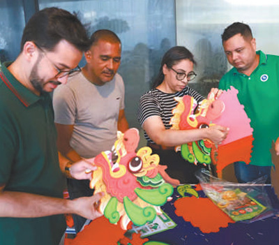 2月3日,巴西民众在累西腓春节庙会活动现场体验制作手工龙头。