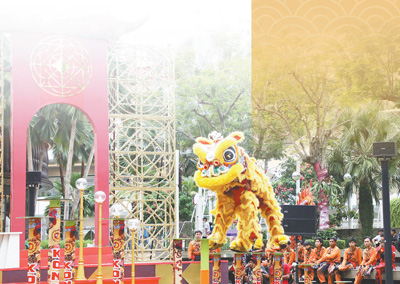 2月3日,在印尼雅加达翠贝卡广场上,人们举行舞狮表演喜迎新春。