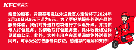 肯德基官网显示,肯德基宅急送外送费官方定价将于2024年2月20日从9元下调为6元。同时,肯德基称,为了更好地提升外送产品的服务体验,对外送打包袋进行了保温升级,并提供专人打包服务,酌情收取打包服务费。此外,大神卡用户在享受满额免外送费的同时,可享受免打包服务费权益。