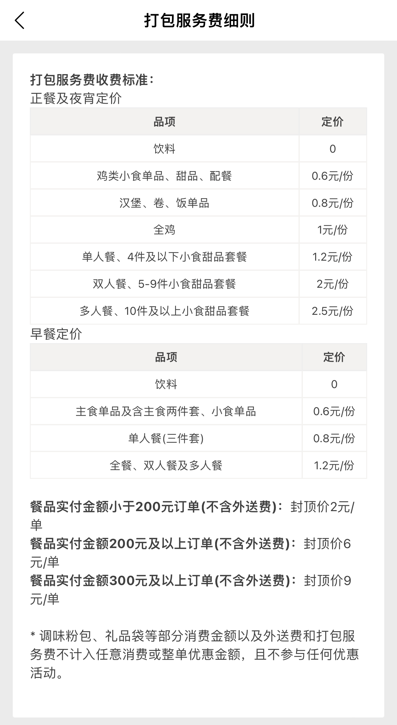 早餐方面,主食单品及含主食两件套、小食单品打包服务费为0.6元/份,单人餐(三件套)打包服务费为0.8元/份,全餐、双人餐及多人餐打包服务费为1.2元/份,饮料不收打包服务费。