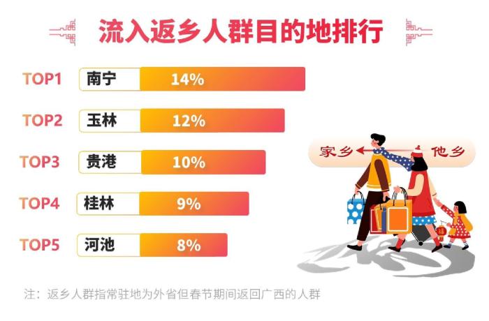 春节期间,广西迎来客流高峰。据统计,广西流入客流同比增长7%,流出客流同比增长18%,净增客流超过1000万人。其中,返桂人潮占比25%,男性成为返乡主力,占比58%。“80后”和“90后”人群成为返乡主流,占比超过50%。交通出行方面,短途游备受青睐,200-500公里出行占比达到48%,汽车成为首选出行方式。