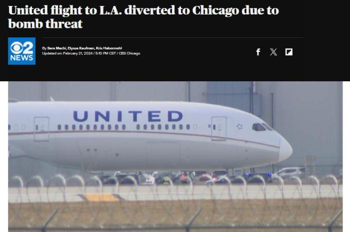 中新网2月22日电 据美国哥伦比亚广播公司(CBS)报道,当地时间21日,美国联合航空公司一架飞往洛杉矶的航班,因收到炸弹威胁,改道飞往芝加哥并紧急降落。目前该航班乘客已被疏散。