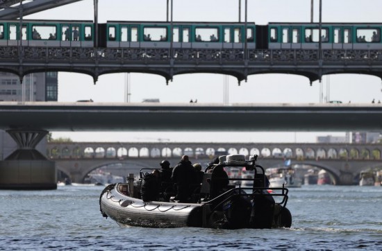 2023年7月17日,船艇参加彩排。当日,巴黎奥组委在法国塞纳河上进行了一场奥运会开幕式迷你彩排。新华社记者高静摄