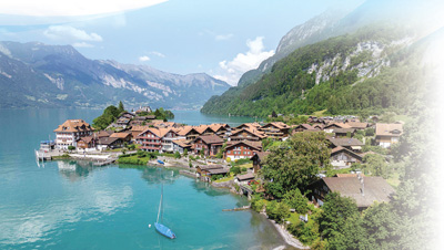 瑞士村庄伊瑟尔特瓦尔德位于阿尔卑斯山布里恩茨湖岸边,风景如画,村中自建房与周边自然环境融为一体。