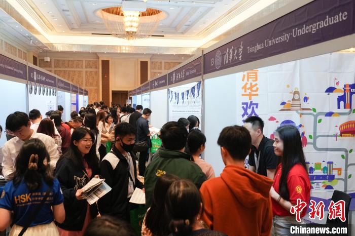 高二学生伊丽莎白8时30分就已到达会场,逐一在高校展台前咨询留学事宜。每了解完一家,她便会在手册的高校名称后做个标记。