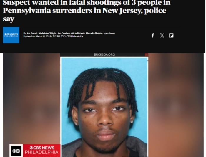 据报道,这名26岁的嫌疑人在两处不同的住宅中杀害了3人,随后劫持了一名司机前往新泽西州,最终在新泽西州一处住宅附近被逮捕。报道称,这起枪击事件的受害人包括嫌疑人的继母和他13岁的妹妹。
