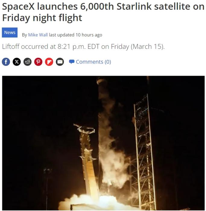 报道称,自2019年第一颗“星链”卫星发射升空后,此次发射将部署在太空的“星链”卫星总数量增加到6000多颗。